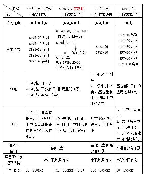 手持式加熱機是對小分機設備的一種特殊設計和應用。 按照設備的結構和工作原理不同,雙平手持式加熱機暫時分為以下4個系列,其特點和結構對比如下表: 其中SPY3系列和SPYD定制系列由于其突出的優點,應用非常廣泛,而且隨著智能設備和自動化進程的發展,這類設備的應用將越來越多;
